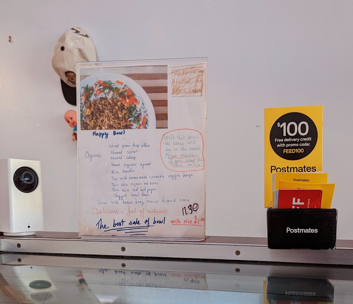 Seller bowl, lettuce, shaved carrot, bean sprout, rice, noodles, and topped mth our crumble award-winning house-made veggie burger & surrounded with red onion, shaved celery, red bell peppers, basil, Bragg sauce.