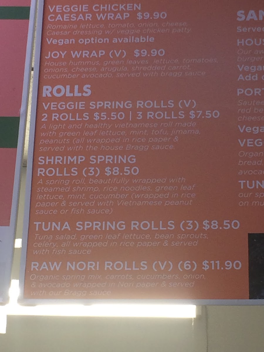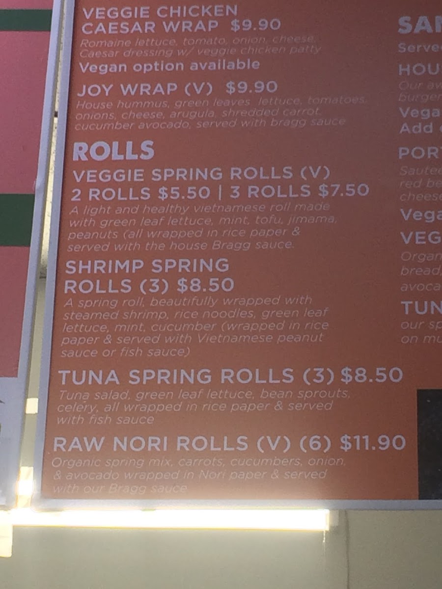 A light and healthy Vietnamese roll made with green leaf lettuce, mint, tofu, jicama, and peanuts-all wrapped in rice paper and served with the house Bragg sauce.